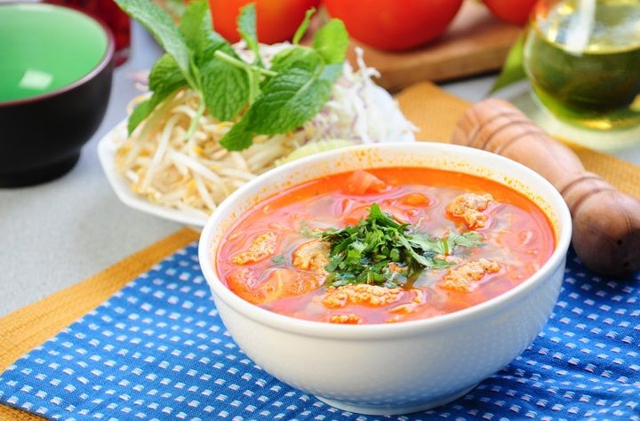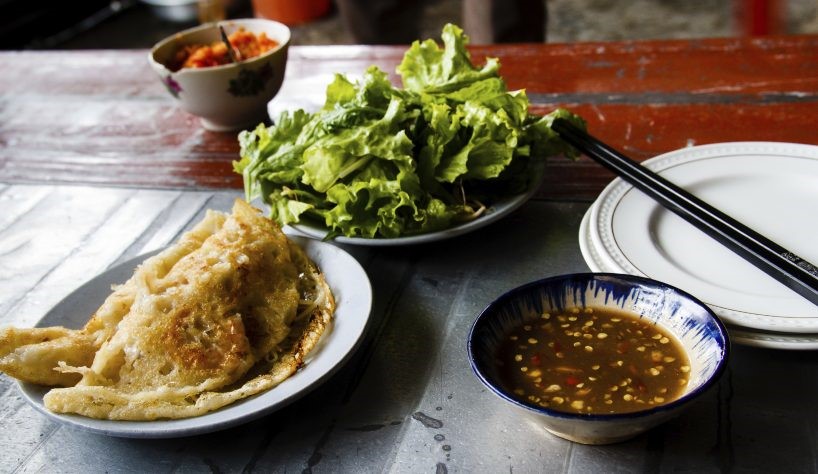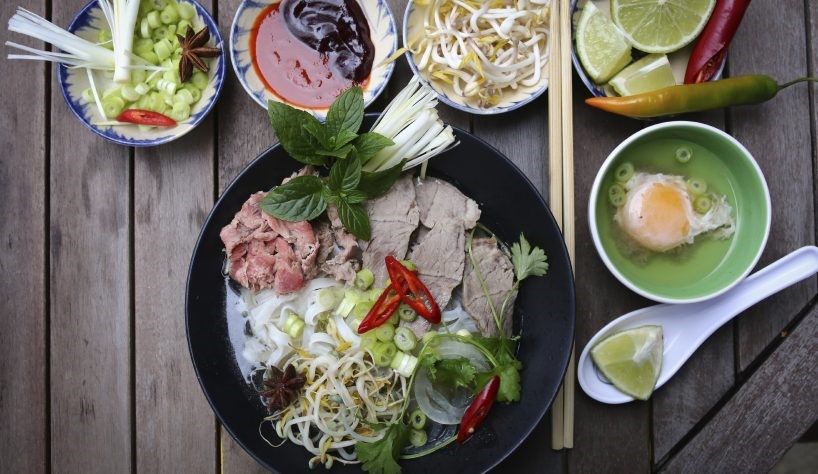 This traditional breakfast noodle soup features rice-paddy crab ground into an umami paste and served in a tomato broth with greens, round vermicelli, sliced beef, tofu and banana flower. Hanoi also offers versions with sea snails for those adventurous of palate. Load up with spice and fresh greens and savour each sip watching the morning’s traffic stream by.